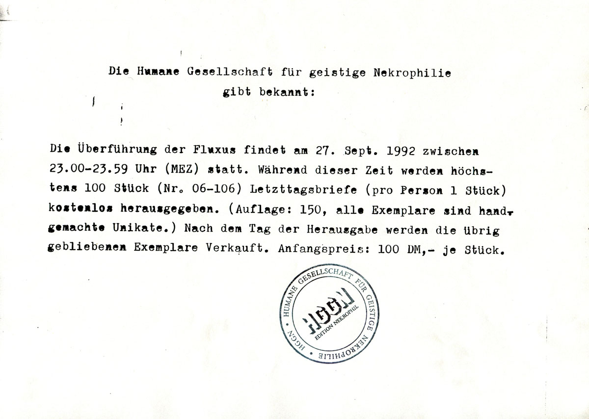 Fluxus/Luxus – Die HGGN gab zum Gedenken an Fluxus einen Letztagsbrief heraus / The HGGN issued a Last Day Issue in memory of Fluxus – 27. September 1992, Ultimate Akademie, Köln