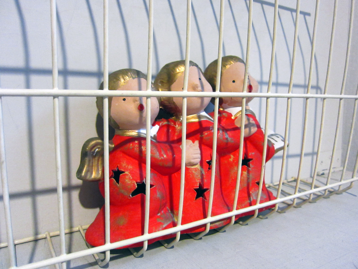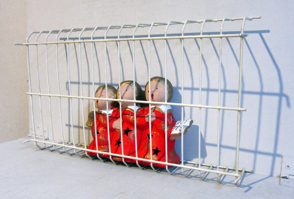 Engel / Angels – 1989; Gittereinrichtung, 45x24x11 cm; Keramikfigur „Drei pfeifende Engel“; Grid arrangement, 45x24x11 cm; ceramic figurine „Three whistling angels“