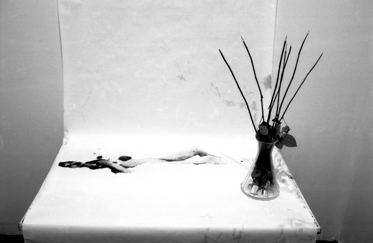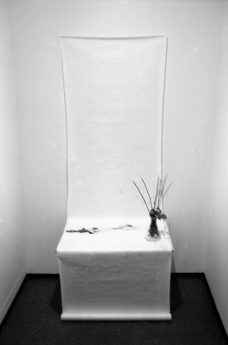 White Wedding – s/w Vintage auf Dokupapierrolle, geschätzte Größe ca. 120×350 cm; Glasvase mit geschnittenen Blumen; die Installation ist nicht mehr vorhanden // b/w vintage print on CV paper roll, estimated size approx. 120×350 cm; glass vase with cut flowers. The installation does not exist anymore.