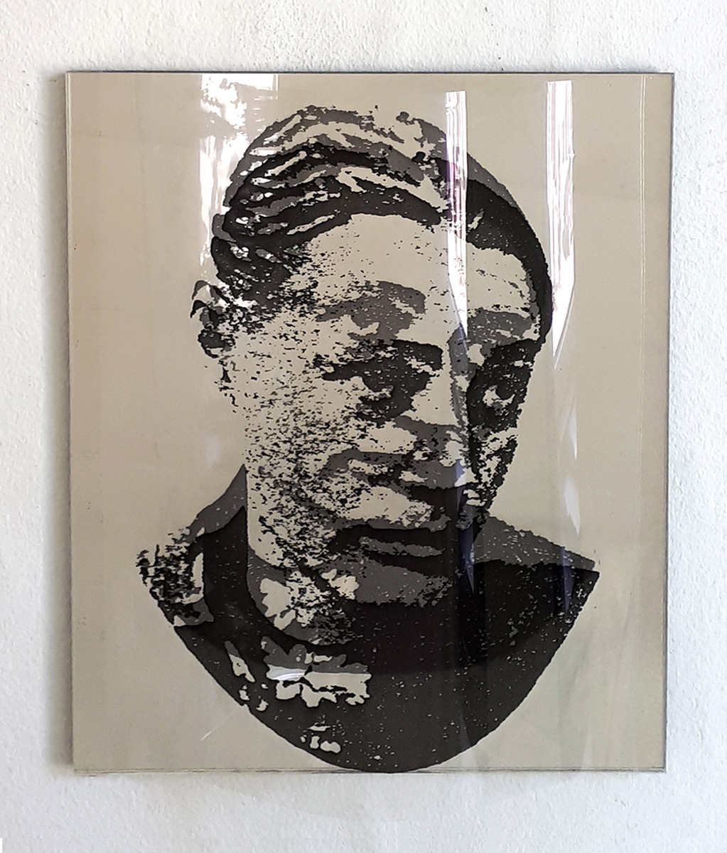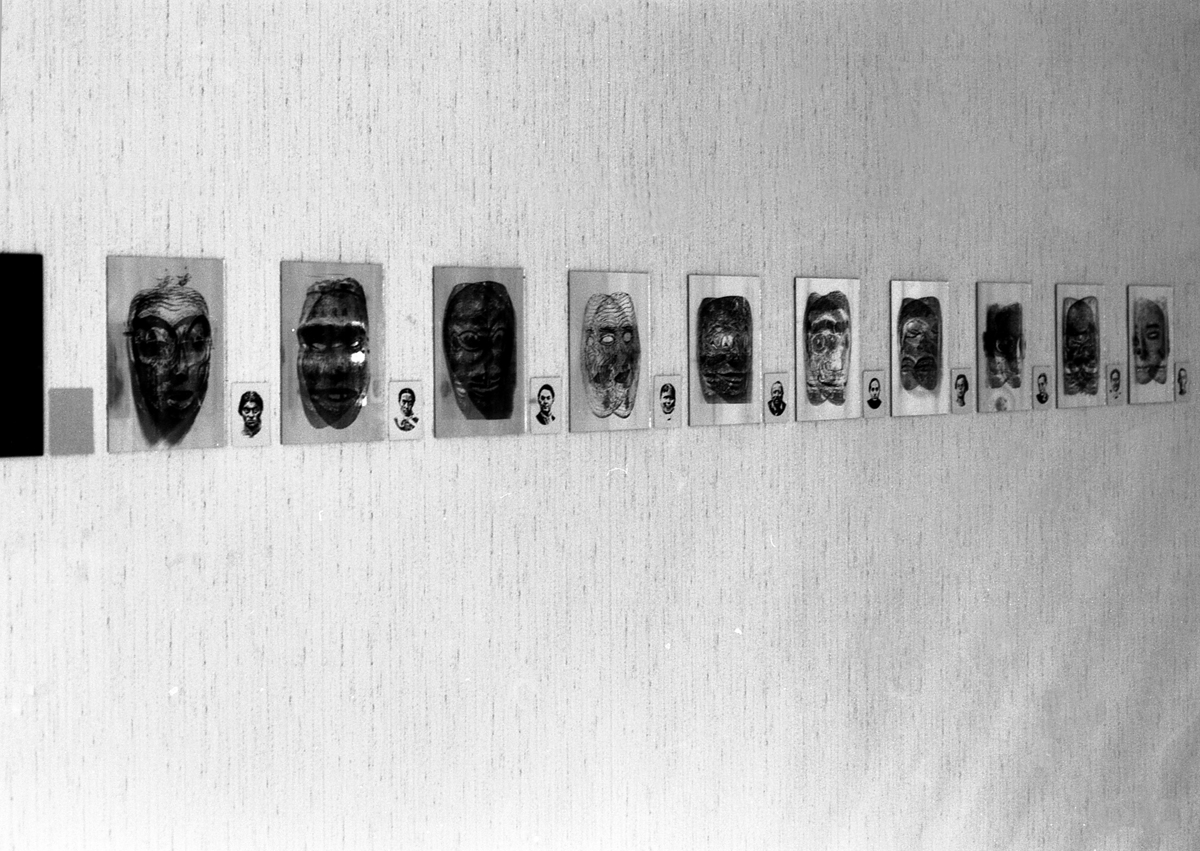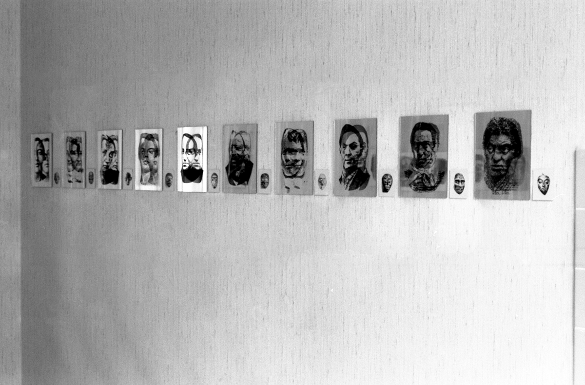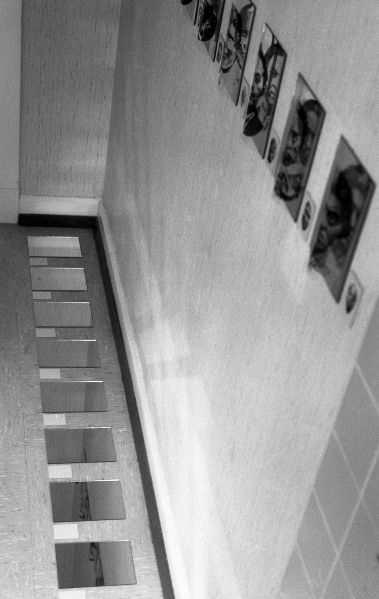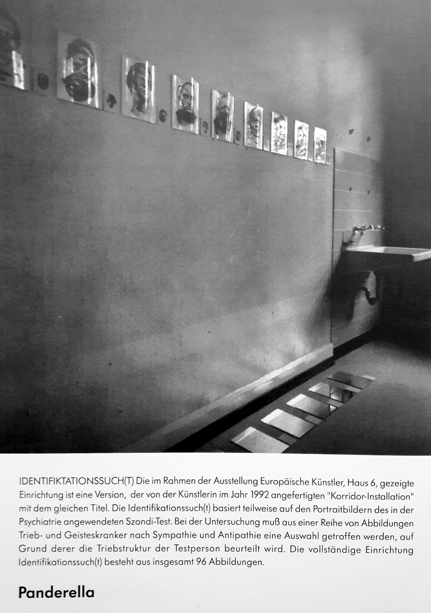 Identifikationssuch/t (unter dem Pseudonym Marie-Louise Panderella, auch mit dem Titel: Korridor-Installation) – 1992 (Bedburg-Hau); Raumgröße ca. 5×2,5 m; 10 auf Spiegel montierte Portraits aus dem Szondi-Test, transparente PE-Folie, je 17×24 cm; ebensolche Portraits auf Karton, je 6x8cm; 10 auf Spiegel montierte Maskenbilder, transparente PE-Folie, je 17×24 cm; ebensolche Maskenbilder auf Karton, je 6x8cm; 4 schwarze Spiegel, je 17×24 cm; 24 Spiegel, je17x24 cm; 24 leere Kartons, je 6×8 cm; Arrangement: die 10 Portraits und Masken wurden sich jeweils auf den langen Wänden des Raumes genau gegenübergestellt. Neben den jeweils großen Portrait- bzw. Maskenbildern (17×24 cm) findet sich das jeweils exakt gegenüberliende Bild auf Karton (6×8 cm). Im exakten Lot mit den großen, bzw. kleinen Wandbildern liegen „leere“ Spiegel, bzw. die leeren Kartons auf dem Boden des Raumes. Vier schwarze Spiegel setzen die Reihe der Maskenbilder auf Länge der gesamten Wand fort. Identification Addiction (under pseudonym Marie-Louise Panderella, alternative title: Korridor-Installation ) – 1992 (Bedburg-Hau); Room size approx. 5×2.5 m. 10 portraits from the Szondi test, mounted on mirror, transparent PE foil, 17×24 cm each; same portraits on cardboard, 6x8cm each; 10 mask images mounted on mirror, transparent PE foil, 17×24 cm each; same portraits on cardboard, 6x8cm each; 4 black mirrors, 17×24 cm each; 24 mirrors, 17×24 cm each; 24 empty boxes, 6×8 cm each. Arrangement: the 10 portraits and masks were placed directly opposite each other on the long walls of the room. Right next to each respective large portrait/mask image (17×24 cm), the cardboard image (6×8 cm) of the portrait or mask image directly opposed is placed. In the direct lines between the large and small pictures, the “empty” mirrors / empty boxes are placed on the room floor. Four black mirrors continue the row of mask images on the length of the total wall.