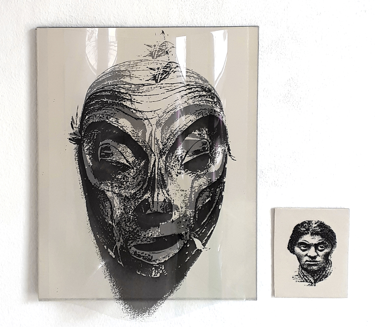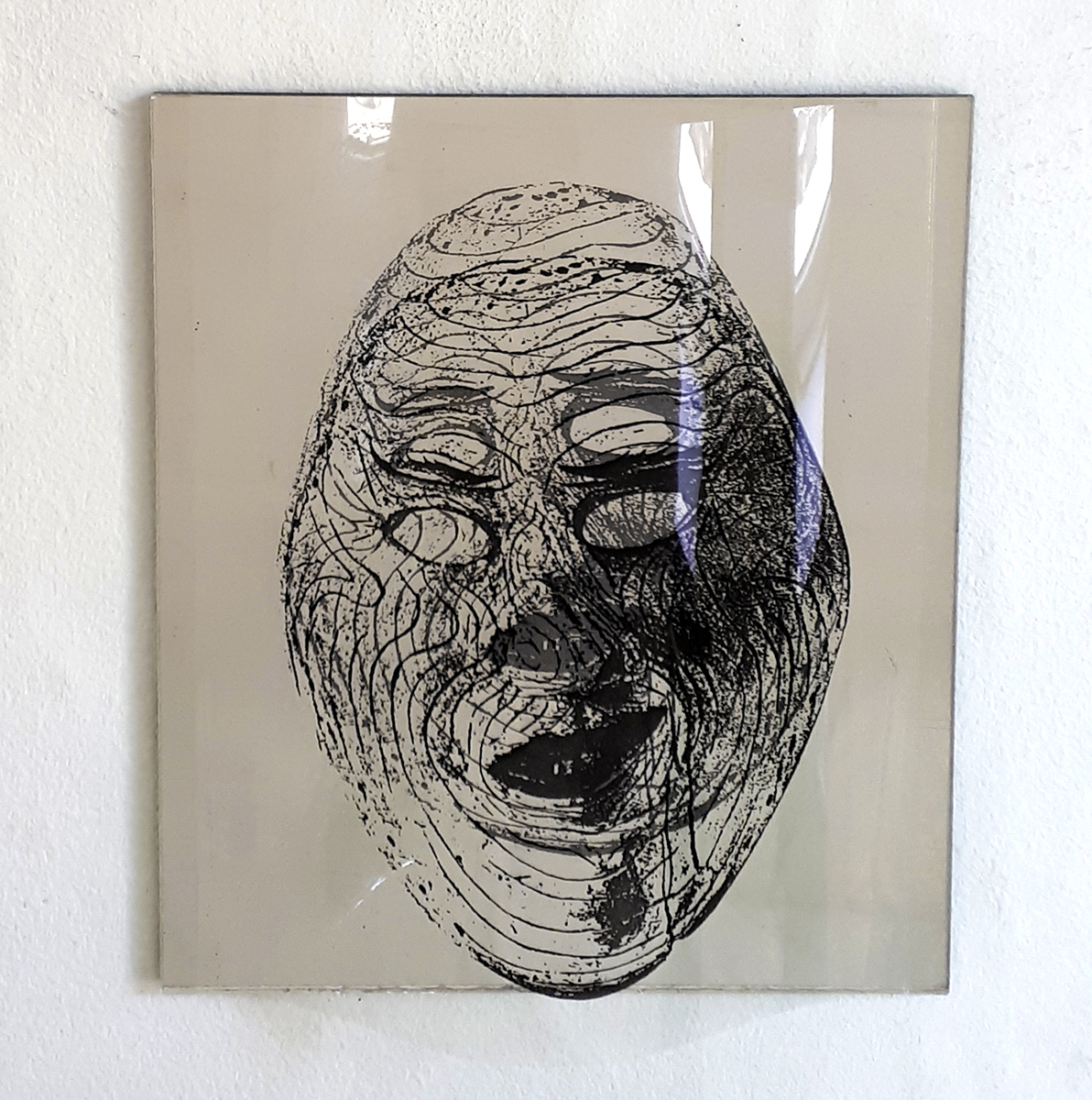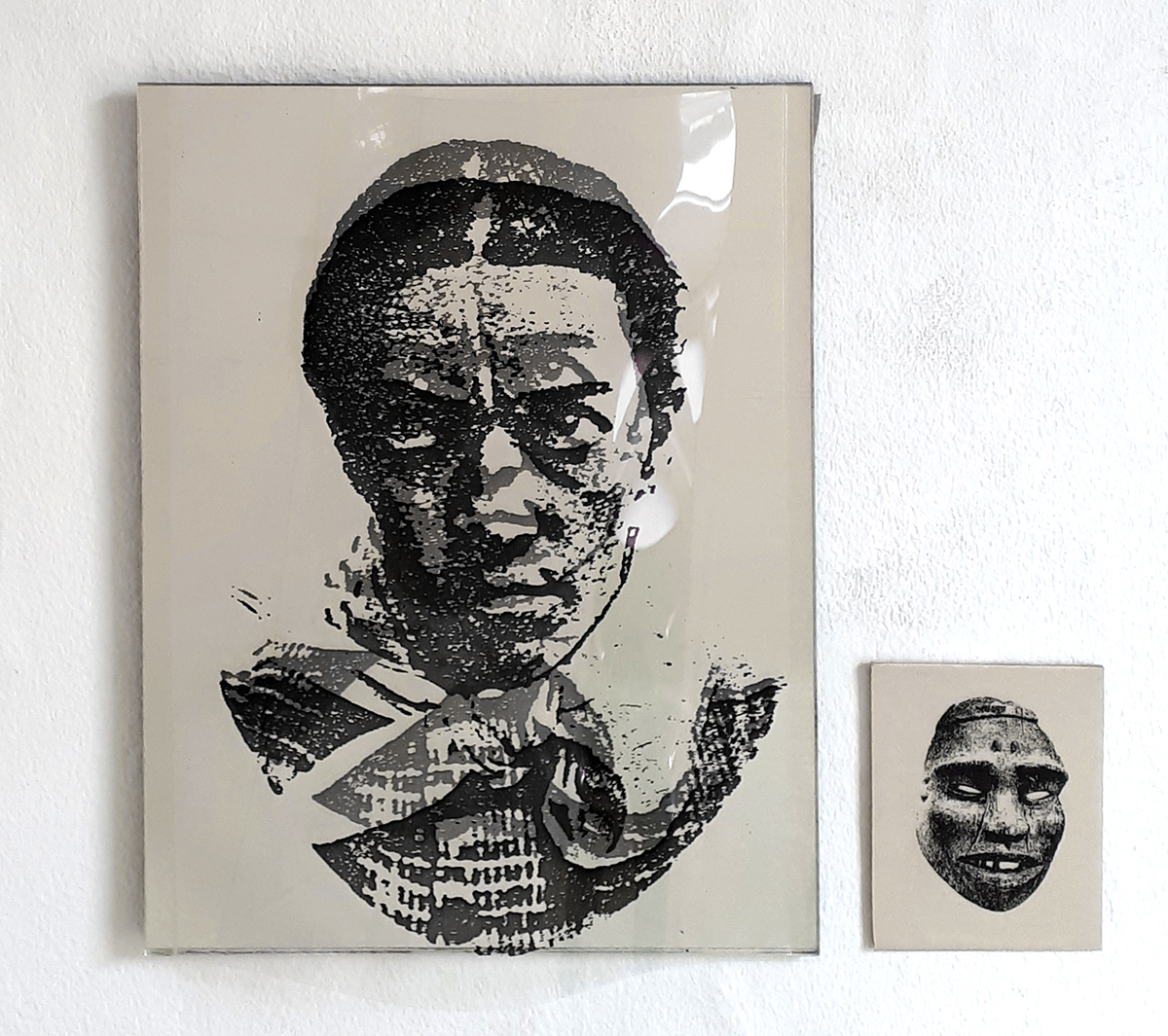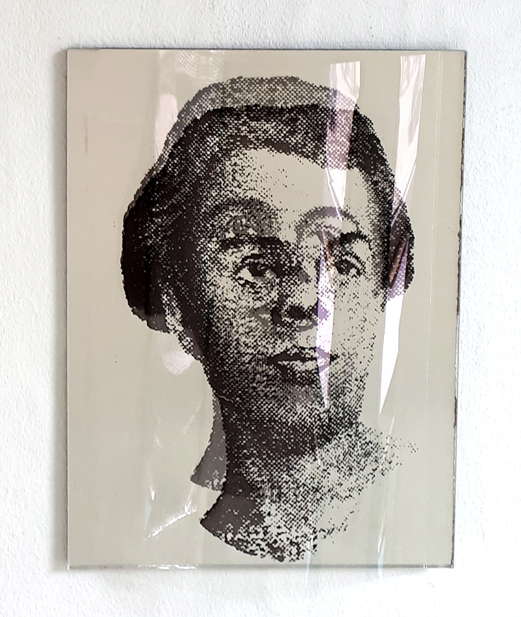 Identifikationssuch/t (unter dem Pseudonym Marie-Louise Panderella, auch mit dem Titel: Korridor-Installation) – 1992 (Bedburg-Hau); Raumgröße ca. 5×2,5 m; 10 auf Spiegel montierte Portraits aus dem Szondi-Test, transparente PE-Folie, je 17×24 cm; ebensolche Portraits auf Karton, je 6x8cm; 10 auf Spiegel montierte Maskenbilder, transparente PE-Folie, je 17×24 cm; ebensolche Maskenbilder auf Karton, je 6x8cm; 4 schwarze Spiegel, je 17×24 cm; 24 Spiegel, je17x24 cm; 24 leere Kartons, je 6×8 cm; Arrangement: die 10 Portraits und Masken wurden sich jeweils auf den langen Wänden des Raumes genau gegenübergestellt. Neben den jeweils großen Portrait- bzw. Maskenbildern (17×24 cm) findet sich das jeweils exakt gegenüberliende Bild auf Karton (6×8 cm). Im exakten Lot mit den großen, bzw. kleinen Wandbildern liegen „leere“ Spiegel, bzw. die leeren Kartons auf dem Boden des Raumes. Vier schwarze Spiegel setzen die Reihe der Maskenbilder auf Länge der gesamten Wand fort. Identification Addiction (under pseudonym Marie-Louise Panderella, alternative title: Korridor-Installation ) – 1992 (Bedburg-Hau); Room size approx. 5×2.5 m. 10 portraits from the Szondi test, mounted on mirror, transparent PE foil, 17×24 cm each; same portraits on cardboard, 6x8cm each; 10 mask images mounted on mirror, transparent PE foil, 17×24 cm each; same portraits on cardboard, 6x8cm each; 4 black mirrors, 17×24 cm each; 24 mirrors, 17×24 cm each; 24 empty boxes, 6×8 cm each. Arrangement: the 10 portraits and masks were placed directly opposite each other on the long walls of the room. Right next to each respective large portrait/mask image (17×24 cm), the cardboard image (6×8 cm) of the portrait or mask image directly opposed is placed. In the direct lines between the large and small pictures, the “empty” mirrors / empty boxes are placed on the room floor. Four black mirrors continue the row of mask images on the length of the total wall.