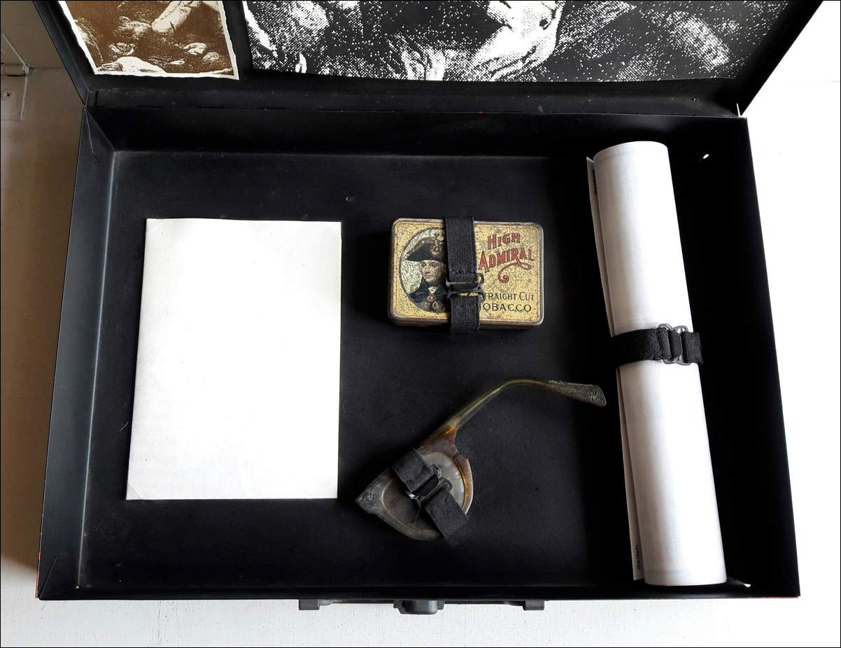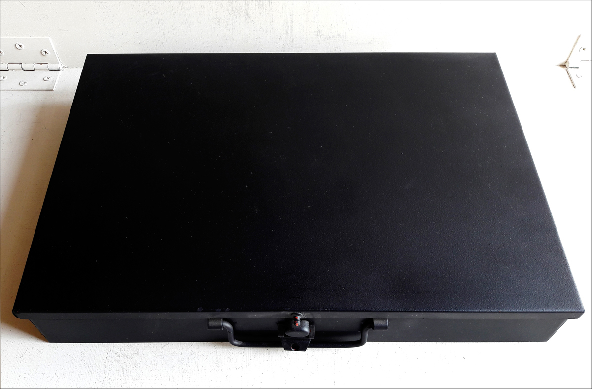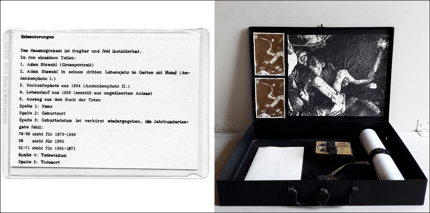 Dead Christening / Totentaufe (Katyn), 1990 – 1 Schwarze Metallkiste, ca. 32,5×23,3×4,7 cm. Inhalt: 1 Portraitsfoto, s/w Vintage auf Barytpapier, 19,5×24 cm; sogenannte Andenkenfotos, braun getönte s/w Vintage auf Barytpapier, 7,4×10,1 cm; handgeschriebener Lebenslauf, 21×29 cm, gefaltet; Totenliste, 21,8×31 cm, gerollt; 1 gebrochenes Brillenstück, ca. 13×6 cm; 1 Tabakbox, Blech, ca. 8×5,5×1 cm; 3 Täfelchen (Titel, Erläuterungen, Übersetzung des Lebenslaufs), je 11×8 cm // 1 black metal box, approx. 32.5×23.3×4.7 cm. Content: 1 portrait photo, b/w vintage on barite paper, 19.5×24 cm; so-called Photo Memories (Andenkenfotos), brown tinted b/w vintage on barite paper, 7.4×10.1 cm; handwritten resume, 21×29 cm, folded; death list, 21.8×31 cm, rolled; 1 broken eyeglass piece, approx. 13×6 cm; 1 tobacco box, tin, approx. 8×5.5×1 cm; 3 tablets (title, remarks, translation of resume), 11×8 cm each.
