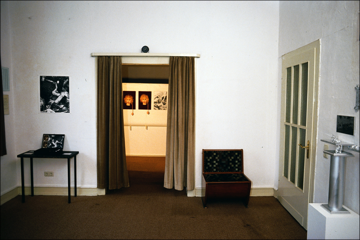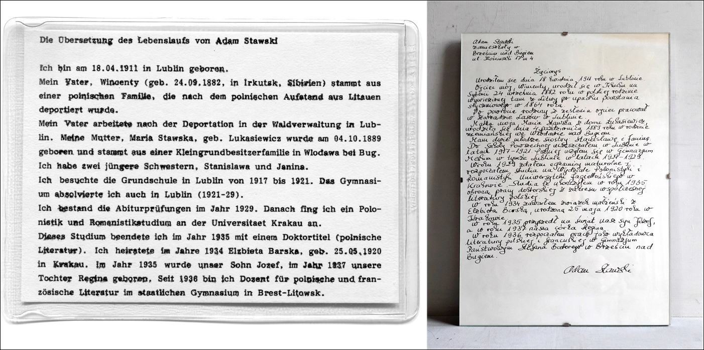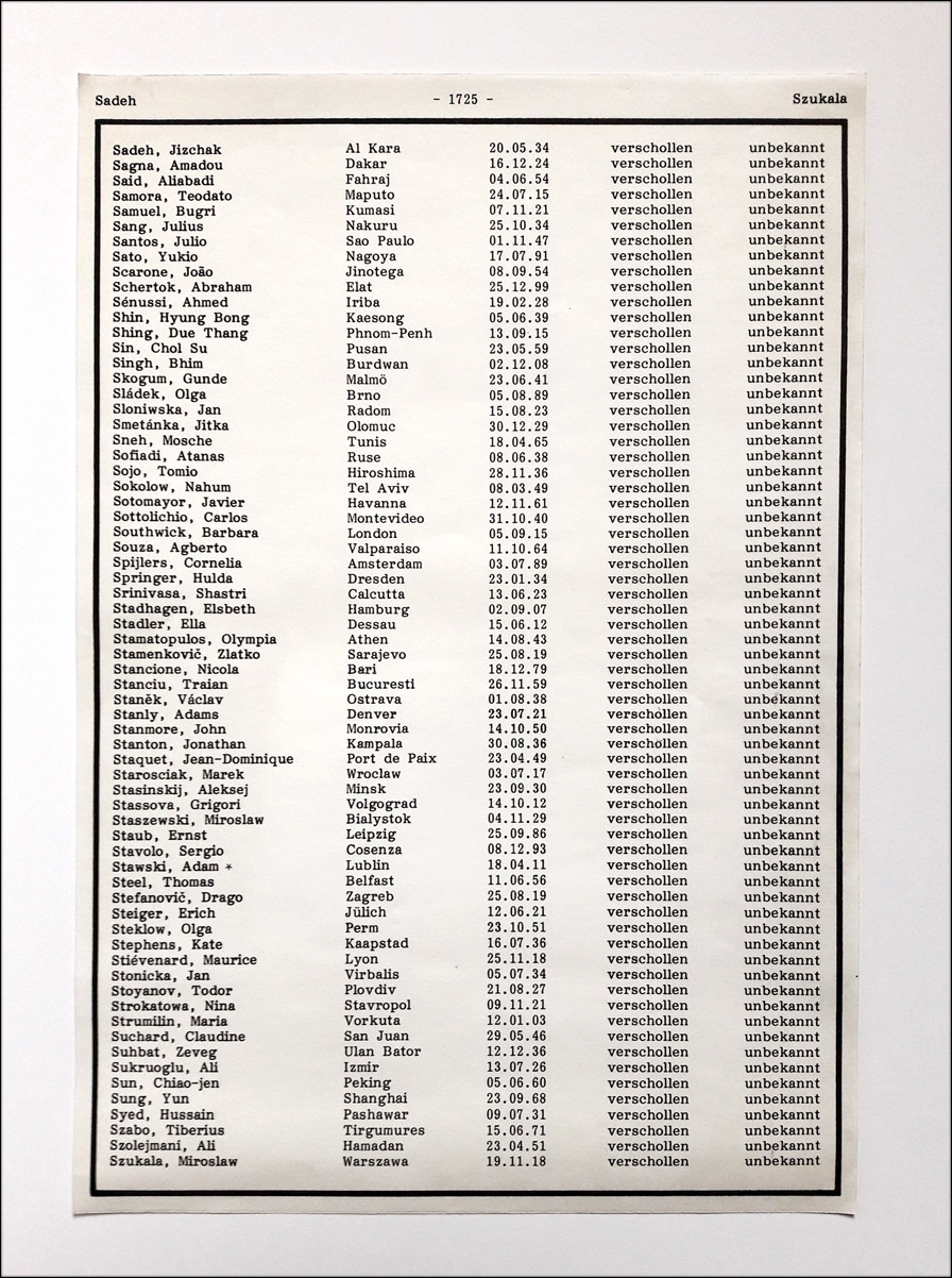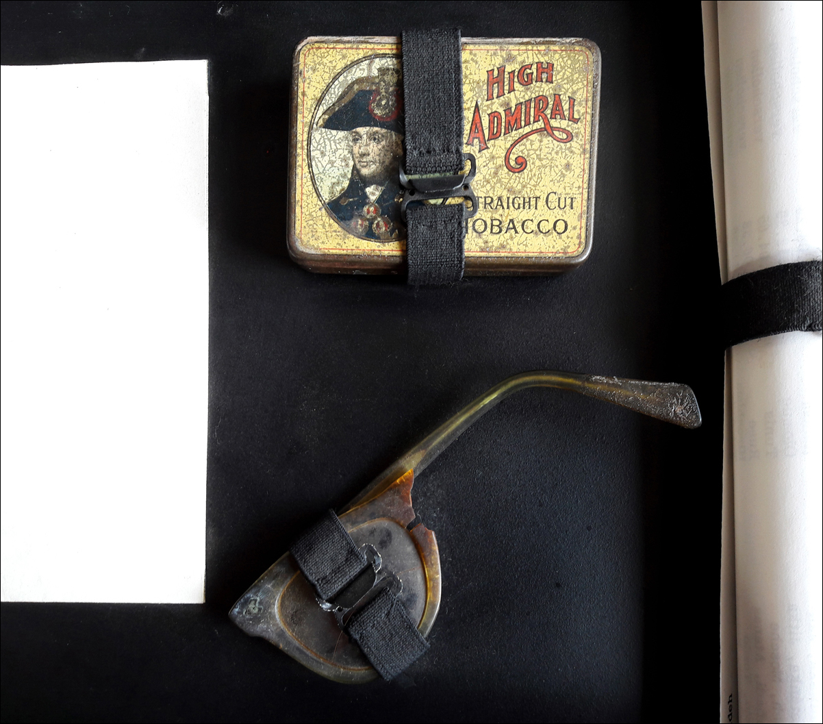 Dead Christening / Totentaufe (Katyn), 1990 – 1 Schwarze Metallkiste, ca. 32,5×23,3×4,7 cm. Inhalt: 1 Portraitsfoto, s/w Vintage auf Barytpapier, 19,5×24 cm; sogenannte Andenkenfotos, braun getönte s/w Vintage auf Barytpapier, 7,4×10,1 cm; handgeschriebener Lebenslauf, 21×29 cm, gefaltet; Totenliste, 21,8×31 cm, gerollt; 1 gebrochenes Brillenstück, ca. 13×6 cm; 1 Tabakbox, Blech, ca. 8×5,5×1 cm; 3 Täfelchen (Titel, Erläuterungen, Übersetzung des Lebenslaufs), je 11×8 cm // 1 black metal box, approx. 32.5×23.3×4.7 cm. Content: 1 portrait photo, b/w vintage on barite paper, 19.5×24 cm; so-called Photo Memories (Andenkenfotos), brown tinted b/w vintage on barite paper, 7.4×10.1 cm; handwritten resume, 21×29 cm, folded; death list, 21.8×31 cm, rolled; 1 broken eyeglass piece, approx. 13×6 cm; 1 tobacco box, tin, approx. 8×5.5×1 cm; 3 tablets (title, remarks, translation of resume), 11×8 cm each.
