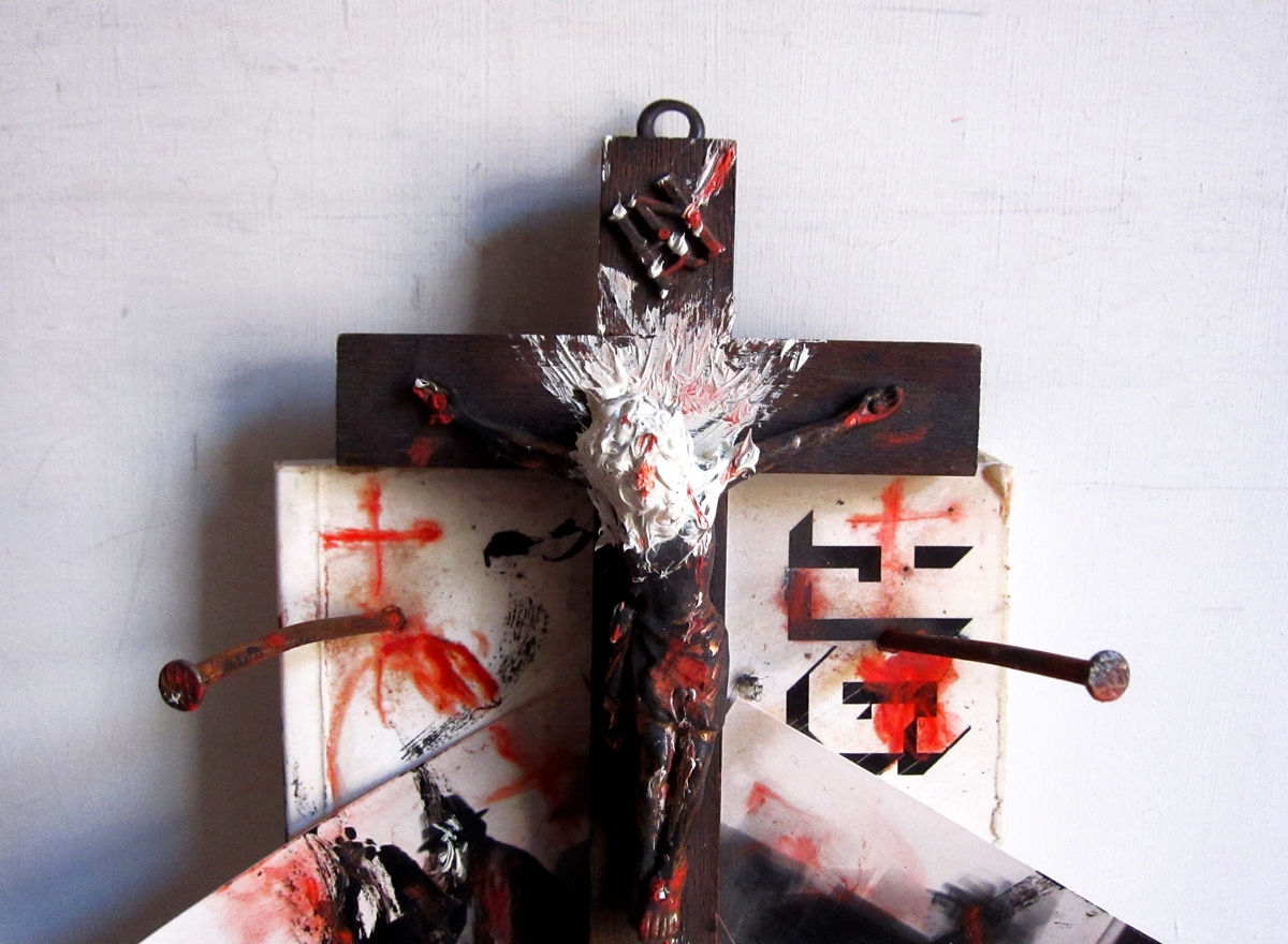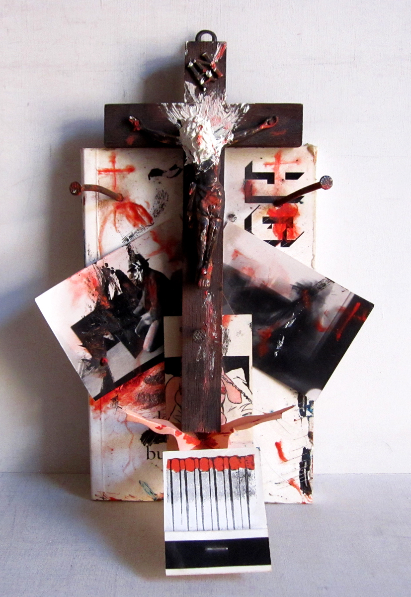 Kreuzbuch / Crossbook – 1989; ca. 15x25x7 cm; auf dem Umschlag ein bemaltes Kruzifix und ein bemaltes, aufklappbares Steichholzbriefchen; das Buch ist mit 3 Nägel vollständig zugenagelt; approx. 15x25x7 cm; cover has a painted crucifix and a painted folding matchbook; the book is completely sealed with three nails