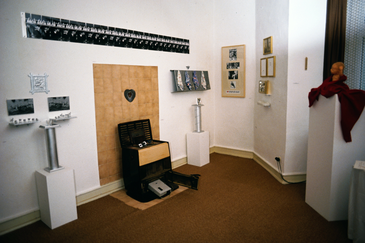 Installationen von links nach rechts: „Tierdenkmal“; Ofeninstallation von Boris Nieslony; darüber „Kulturornamentik“ (zerstört oder verloren); „Versamte Ahnen“; „I love Status Quo“, „Heldendenkmal“, „o. T. – Aufenthaltsgenehmigung“ von Boris Nieslony – Foto: Pietro Pellini; from left to right: „Pet Memorial“; stove installation by Boris Nieslony; above: „Kulturornamentik I“ (destroyed or lost); „Mis-se(e)d Ancestors“; „I love Status Quo“, „Heroic Memorial“, „o. T. – Aufenthaltsgenehmigung“ by Boris Nieslony