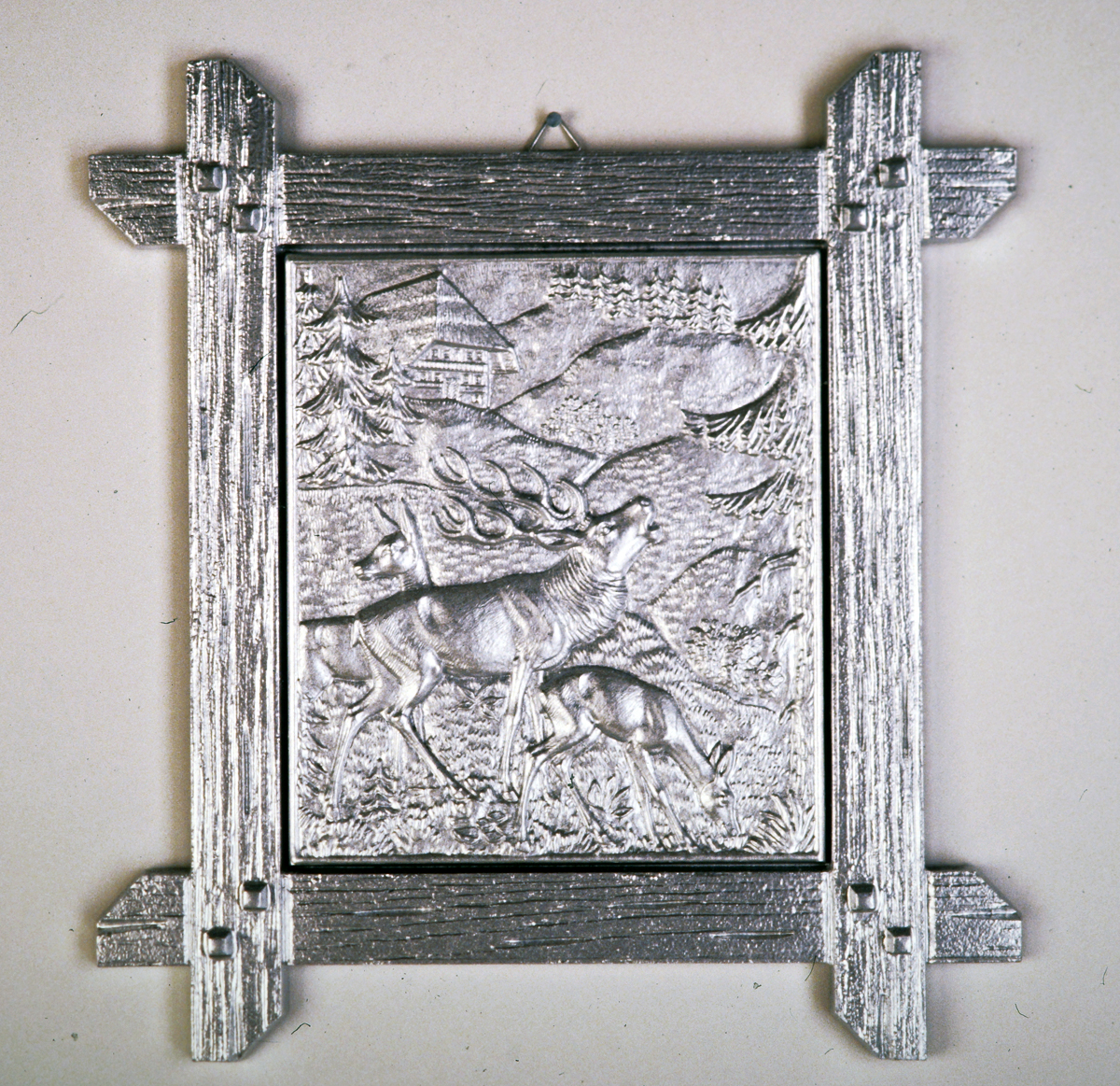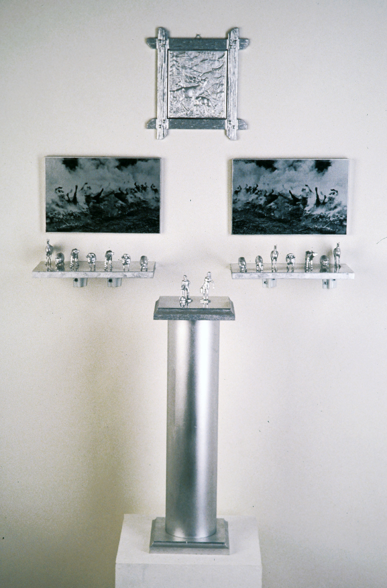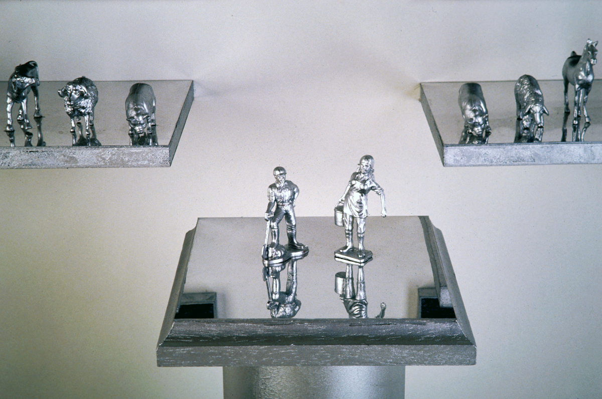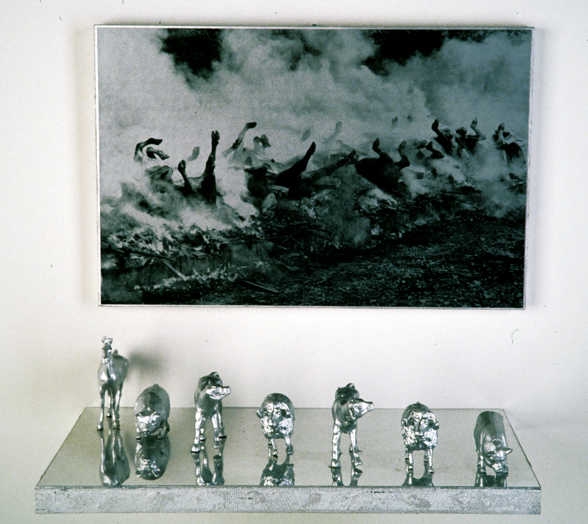 Tierdenkmal / Pet Memorial – „Schreiender Hirsch“, Prägebild aus Metall mit Silberspray lackiert, 22,5×24 cm; Doppelbild „Tierscheiterhaufen“, silber getönte s/w Vintage auf Barytpapier auf Holz aufgezogen, je Bild 26,2×17 cm; zwei mit Spiegeltapeten bezogene Holzregale, mit Silberspray lackierte Hartplastiktiere, Regale je 26×17 cm; Säule aus Pappe, mit Silberspray lackiert, Höhe ca. 53 cm, Durchmesser ca. 11 cm – Foto: Pietro Pellini // „Roaring Deer“, metal coining picture coated with silver spray, 22.5×24 cm; double image „Animal Funeral Pile“, silver tinted b/w vintage print on barite paper, mounted on wood, each picture 26.2×17 cm; two wodden shelves draped with mirror tapestries, duroplastic animals coated with silver spray, each shelf 26×17 cm; cardboard column coated with silver spray, height approx. 53 cm, diameter approx. 11 cm.