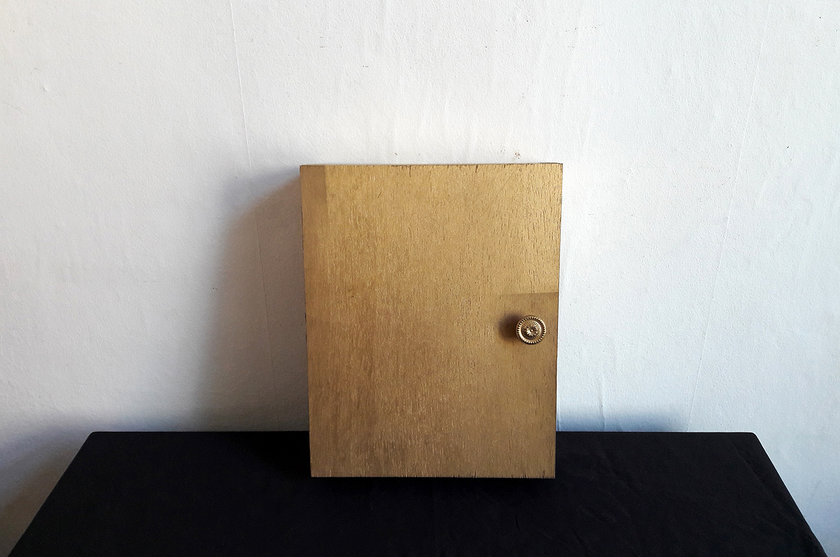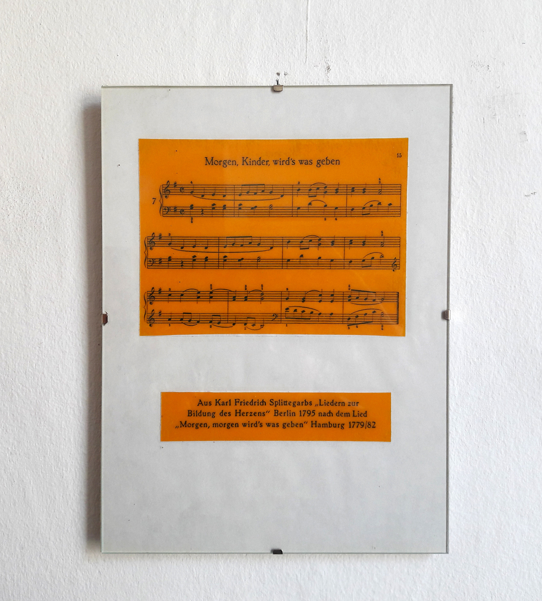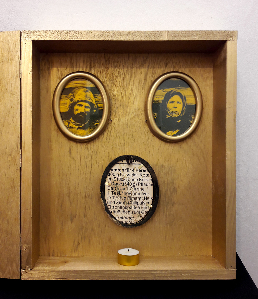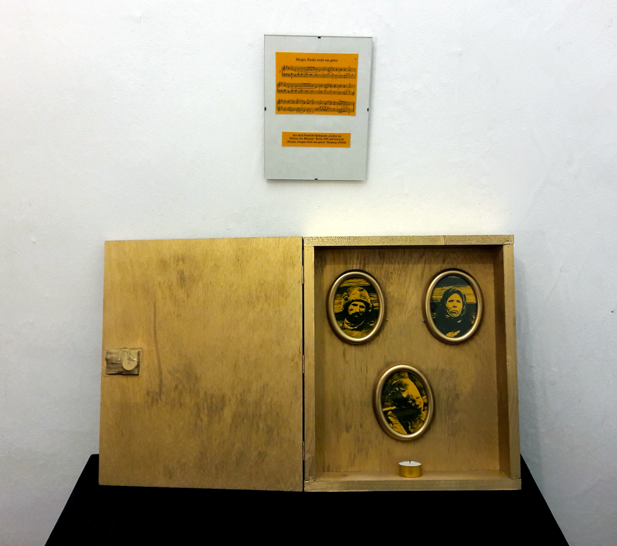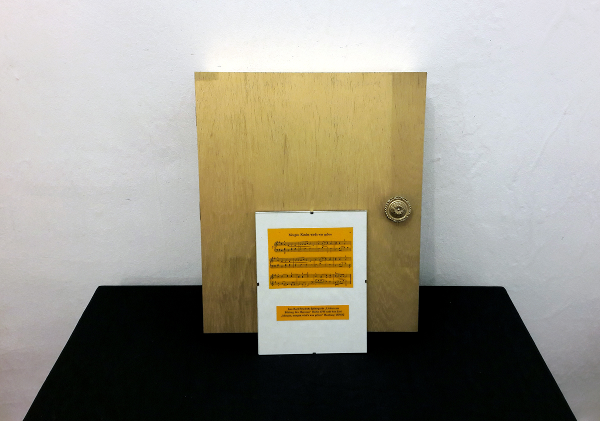 Good Appetite – Morgen Kinder wird’s was geben (Jukebox); wooden box, 36×42.5×9 cm. A music button is mounted on the interior of the lid. The children’s song „Morgen Kinder wird’s was geben“ is triggered with every closing of the lid. Content: 3 portrait pictures covered with yellow foils in oval wooden frame, in verso newspaper clippings with cooking recipes; tea candles; sheet music with songtext of children’s song „Morgen Kinder wird’s was geben“ in frameless picture mount, 18×24 cm and in a plastic sleeve, 11.5×8 cm.