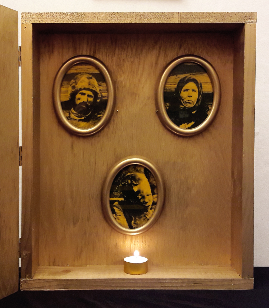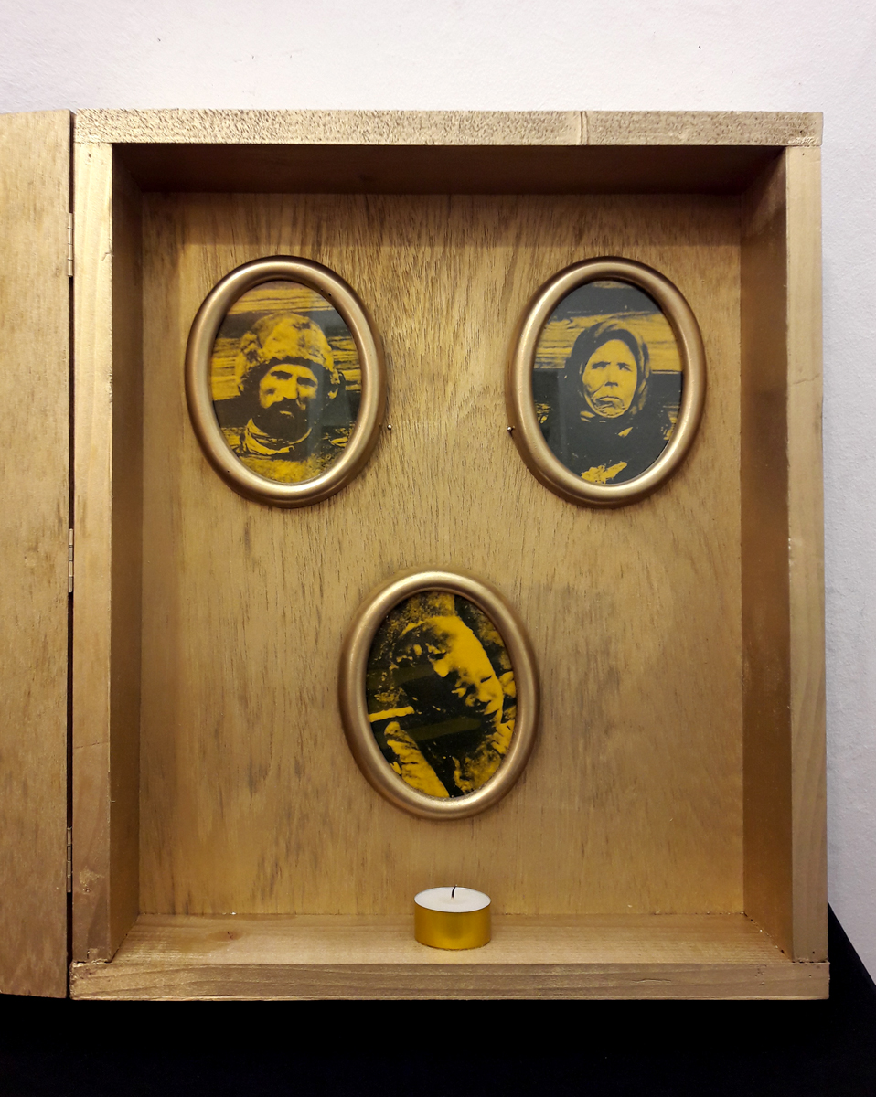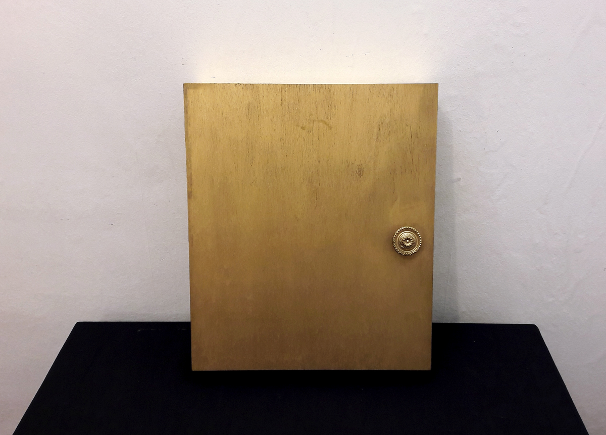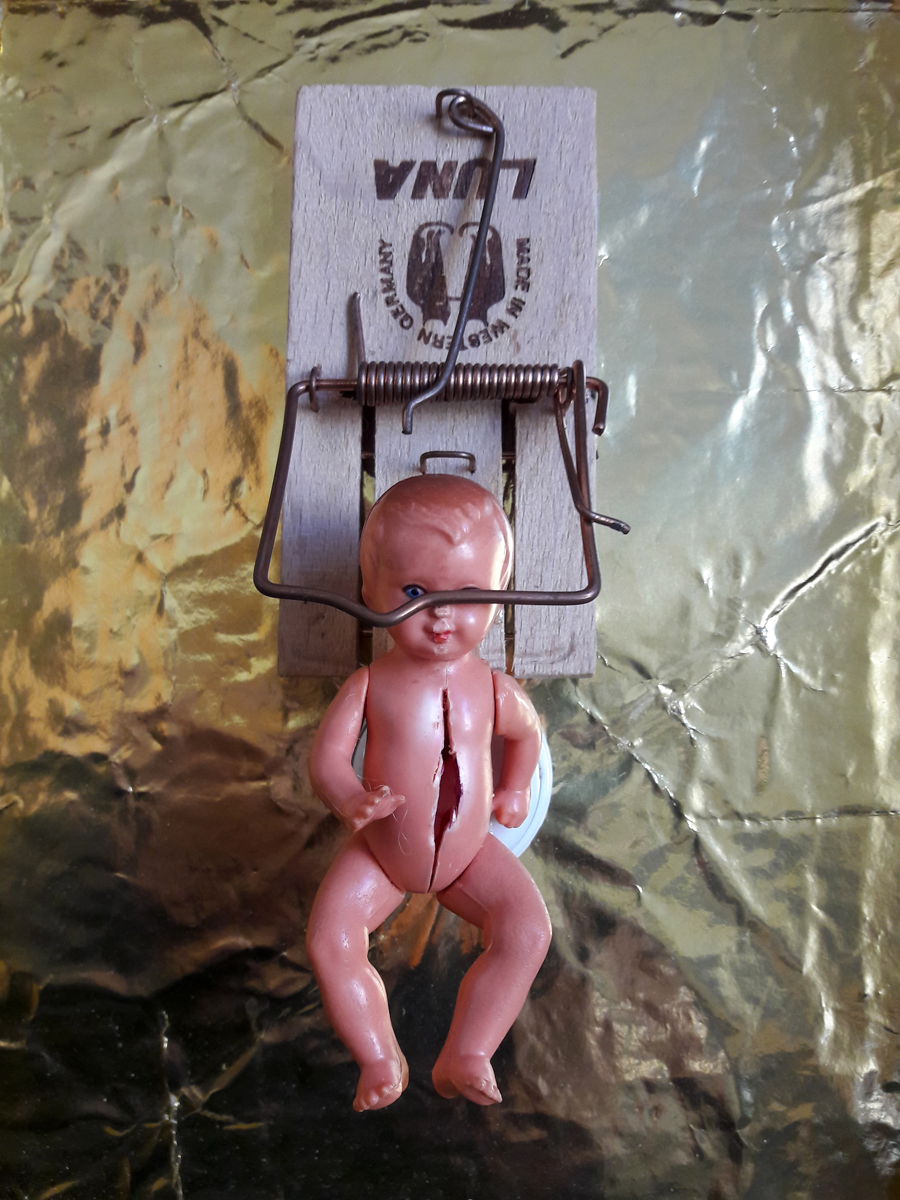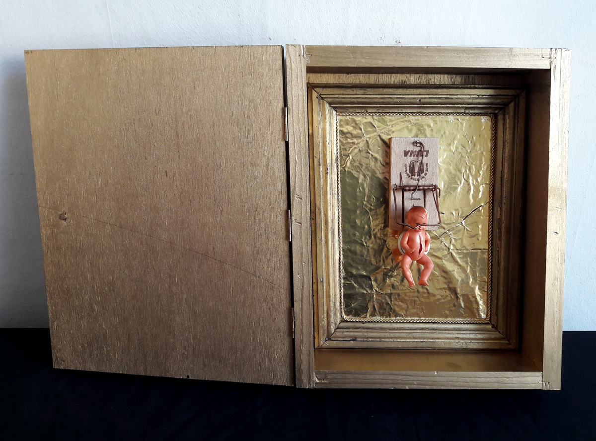 Babytrap (Jukebox); wooden box, 26×32.5×9 cm. Content: plastic doll in mouse trap, mounted on golden metal foil in wooden frame. The doll is mounted on a music button. A children’s song is played when the trap snaps. An image covered with yellow foils (most likely b/w photocopy) was mounted on the back of the installation.