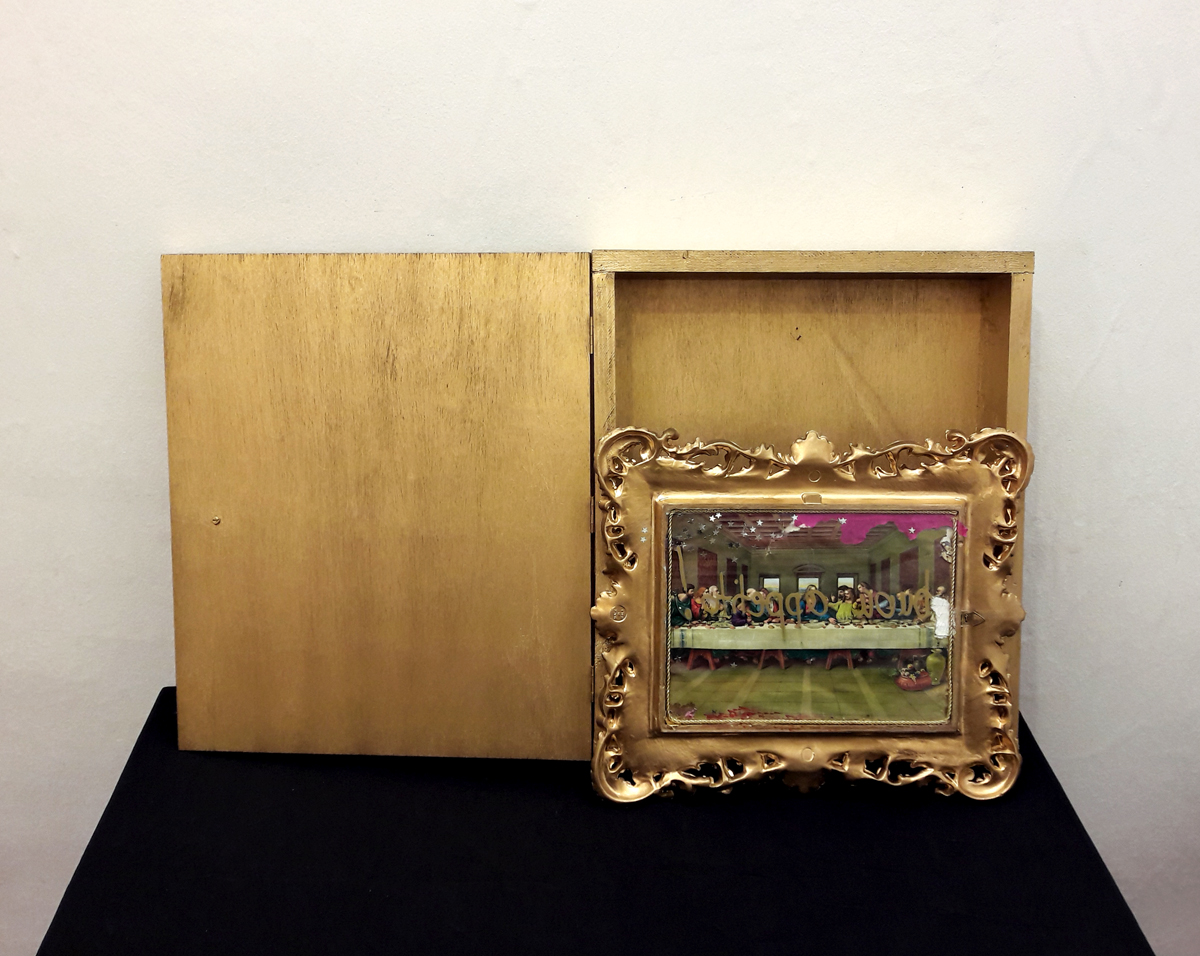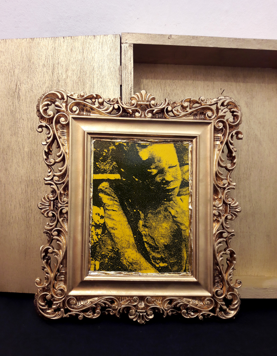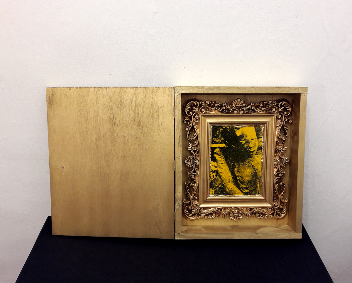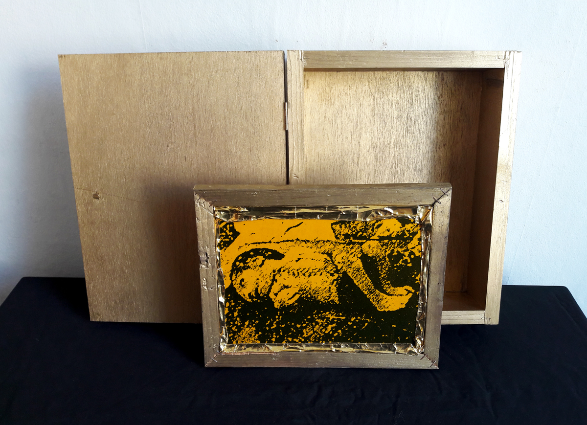 Bon Appétit; wooden box, 36×42.5×9 cm. Content: Double-page picture in decorated gypsum frame, 36×31 cm. Recto: Portrait picture (probably b/w photocopy, motif: „Yorick“, resp. „Das angefressene Kind“) covered with yellow foils. Verso: processed color print behind glass, glass with print in mirror writing: „Bon Appétit“.