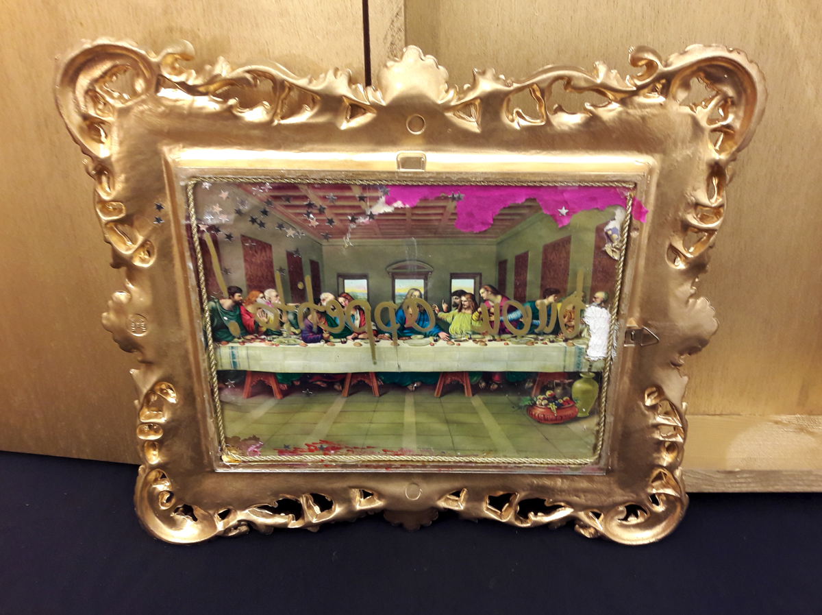 Bon Appétit; Holzkiste, 36×42,5×9 cm. Inhalt: Doppelseitiges Bild in verziertem Gipsrahmen, 36×31 cm. Recto: Portraitbild (wahrscheinlich s/w Fotokopie, Motiv: „Yorick“, bzw. „Das angefressene Kind“) mit gelber Folien bezogen. Verso: berabeiteter Farbdruck unter Glas, Glas mit dem Schriftzug in Spiegelschrift: „Bon Appétit“.